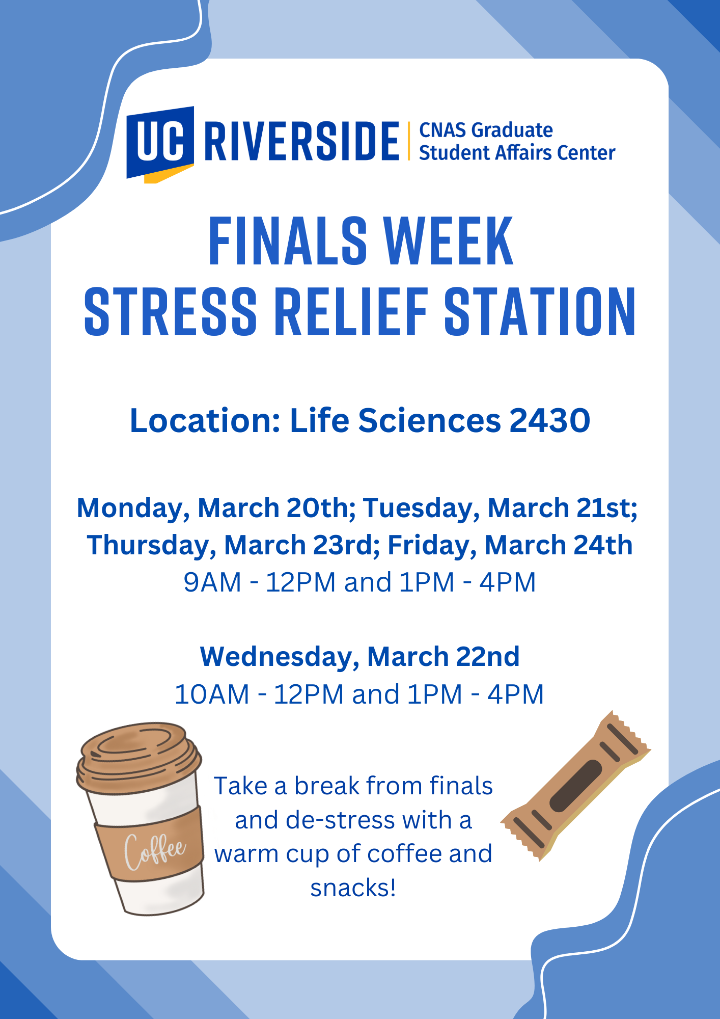 De-stress from finals with a warm cup of coffee and snacks at our stress relief station! Stop by the Graduate Student Affairs Center (2430 Life Sciences) starting Monday, March 20th through Friday, March 24th!