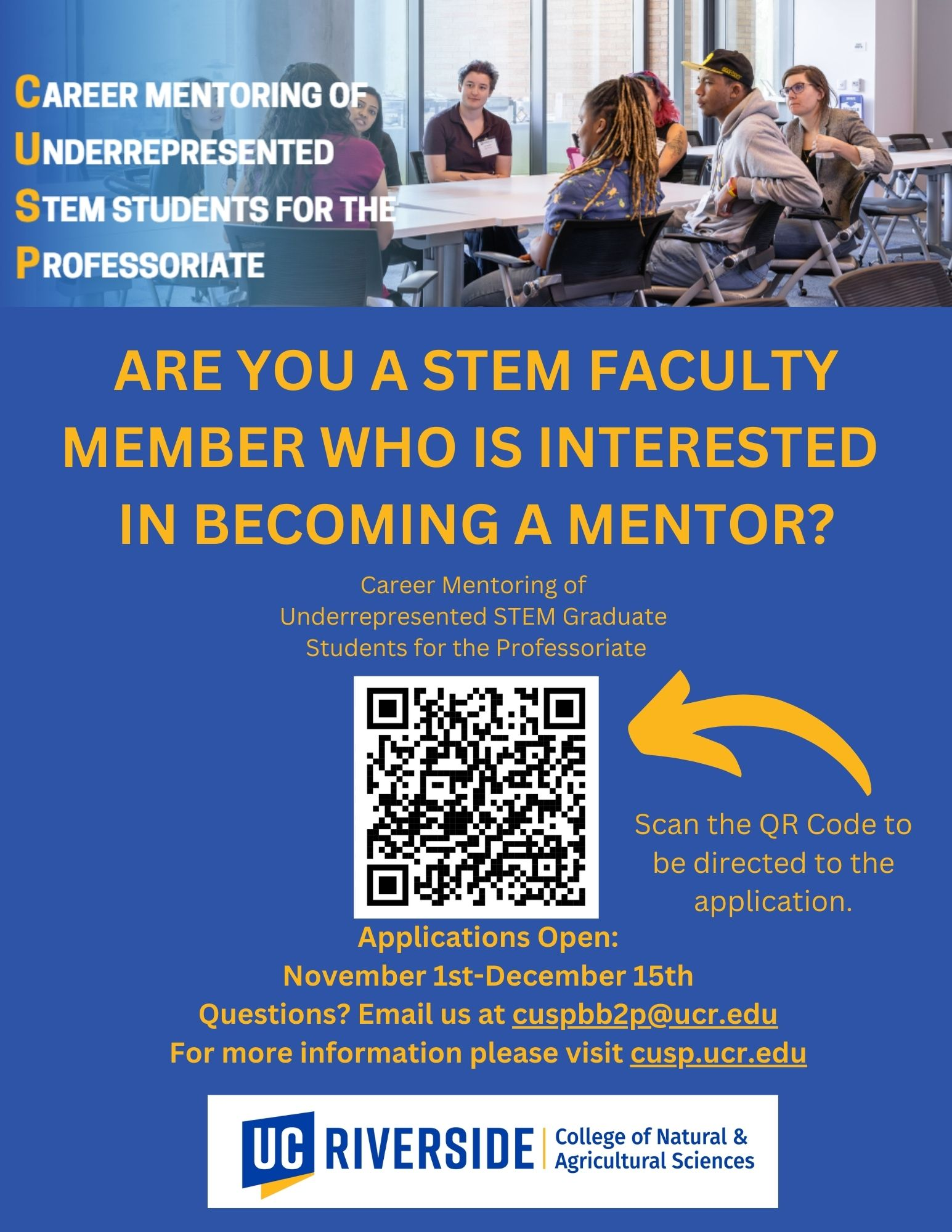 This program, funded by the UC-HSI Doctoral Diversity Initiative (UC-HSI DDI)<https://www.ucop.edu/graduate-studies/initiatives-outreach/uc-hsi-ddi.html>, provides mentoring and career development to graduate students who are interested in becoming professors and are from groups typically underrepresented in science, technology, engineering, and math (STEM). All Faculty in CNAS, Biomedical Sciences, or Bioengineering are welcome to apply here<https://forms.gle/wc1DcYhiqrLRQrMJ7>.