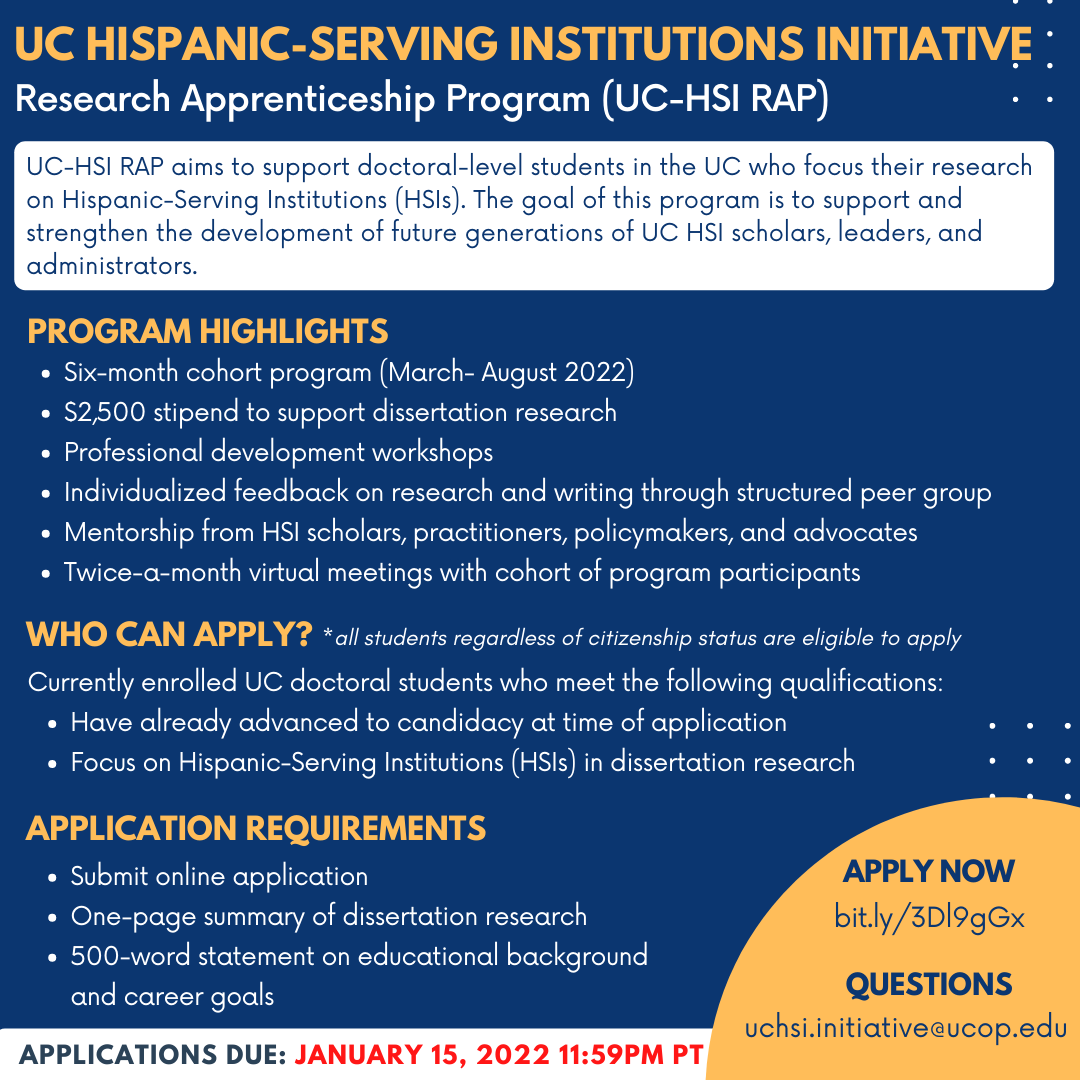 The UC-HSI Initiative's Inaugural Research Apprenticeship Program (UC-HSI RAP) aims to support junior scholars in the UC who focus their dissertation research on Hispanic-Serving Institutions (HSIs). The goal of this program is to support and strengthen the future generations of UC HSI scholars, leaders, and administrators who focus on equity issues in the context of HSIs.