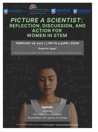 How can we take actionable steps to uplift women in STEM? Join us along with UCR AWIS, UCR GradSuccess, and UCR Library for a screening and discussion of Picture a Scientist!<https://bit.ly/38jhaSz>