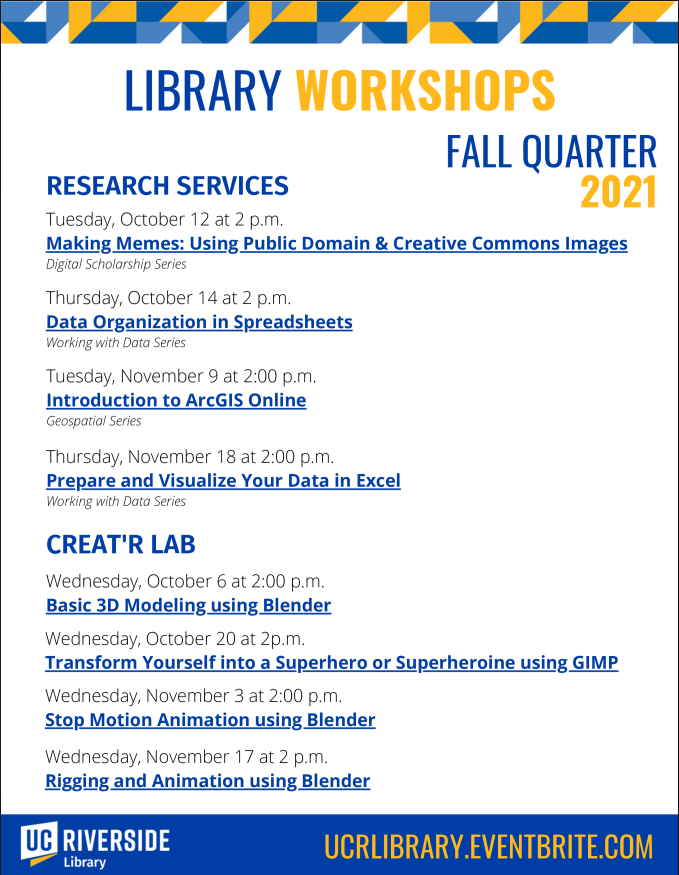 The UCR Library has scheduled online workshops & events for the 2021 Fall quarter.