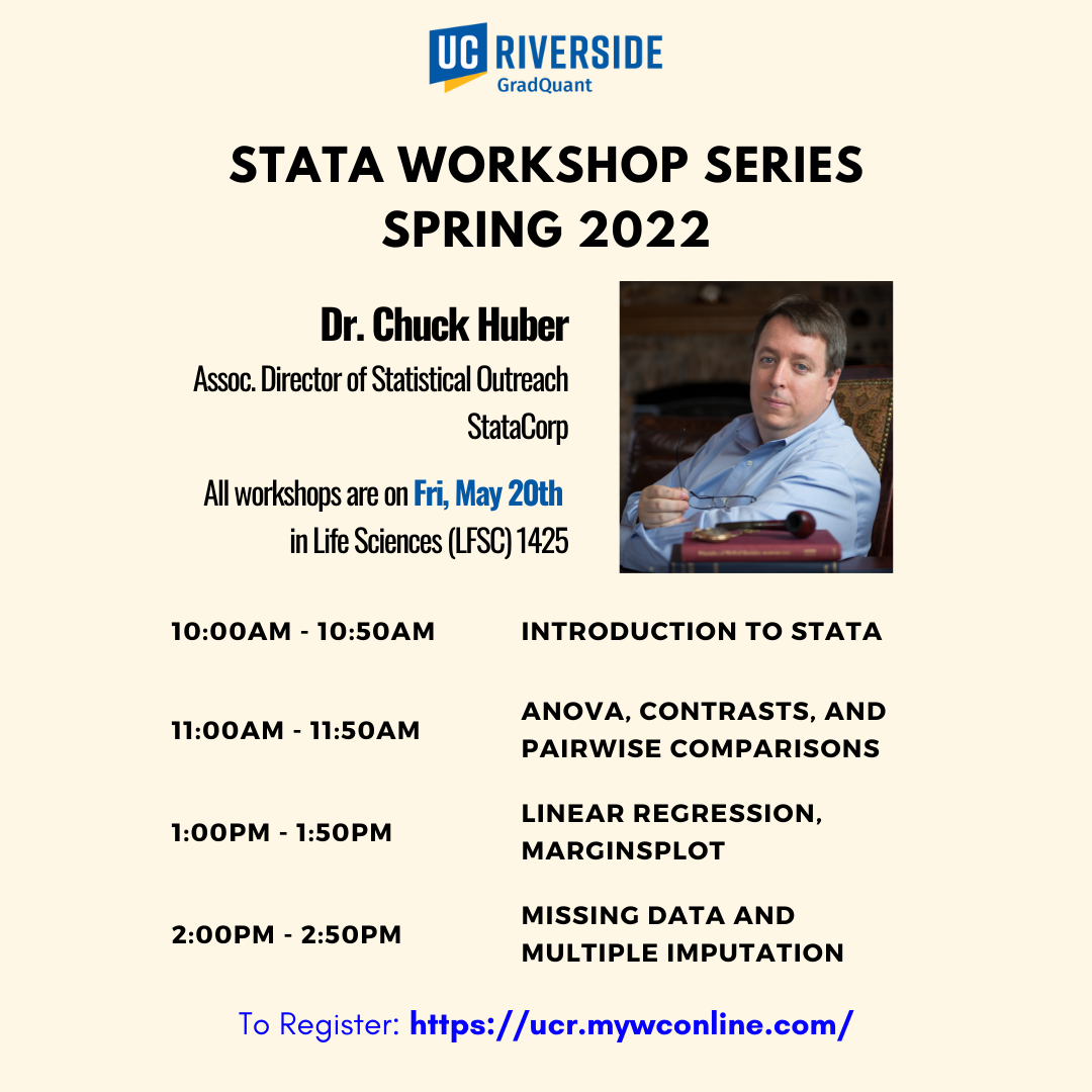 GradQuant is hosting Dr. Chuck Huber from StataCorp on Friday, May 20th for a four-part, in-person workshop series on using Stata for statistical analysis. Workshops are one hour and will be at 10am, 11am, 1pm, and 2pm.