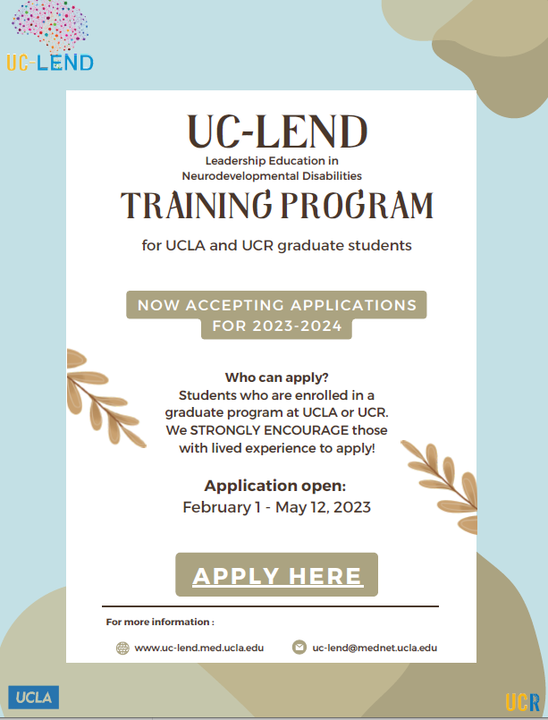 The Leadership Education in Neurodevelopmental Disabilities training program at UCLA and UCR (UC-LEND) is now accepting applications for the 2023-2024 academic year!