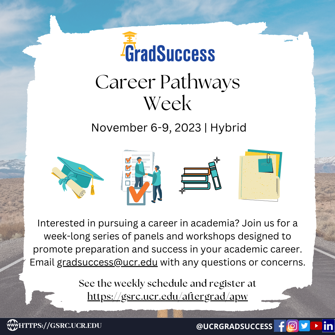 Coming up next week GradSuccess is hosting Career Pathways-Academia. We are offering a week of programming about academic careers, including a keynote address, panels, workshops, and a special coffee social at XCITE. Please share the attached announcement with your graduate students, faculty, and postdocs. You are also welcome to attend if you are interested in learning more about the academic job search.