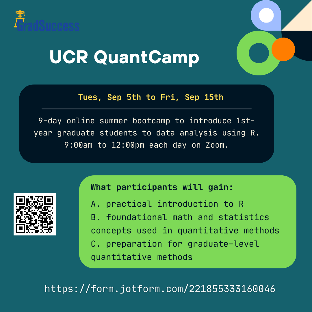There is no cost to students or departments this summer as GradSuccess<https://graduate.ucr.edu/gradsuccess> and GradQuant<https://gradquant.ucr.edu/> provide QuantCamp<https://gradquant.ucr.edu/programs/statsbootcamp> through temporary funding provided by Grad Division<https://graduate.ucr.edu/>.