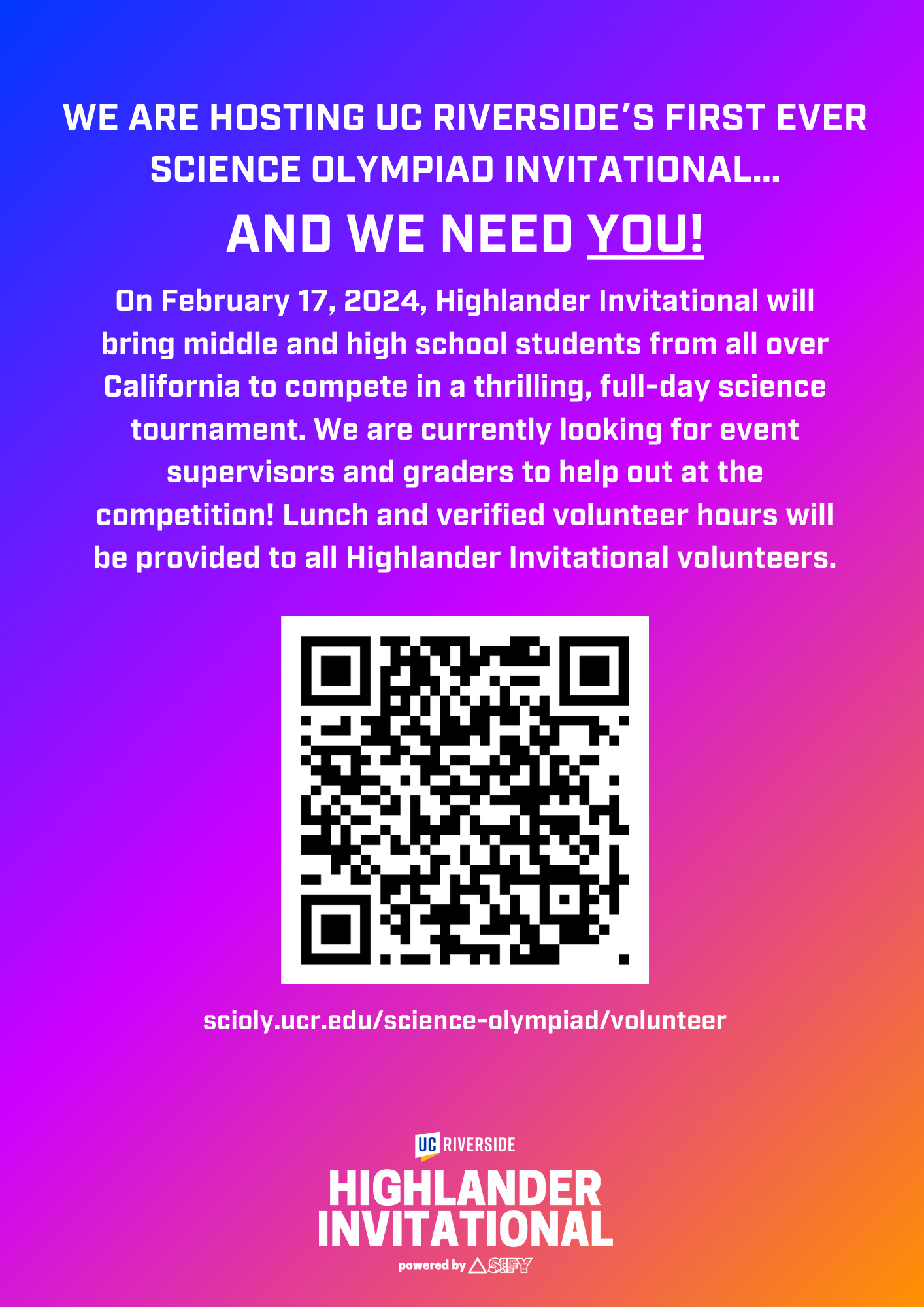 On February 17, 2024, we are hosting an in-person Science Olympiad tournament at UC Riverside called "Highlander Invitational<http://scioly.ucr.edu/>." Highlander Invitational is the Inland Empire's premier STEM competition, where middle and high school students from all over California will compete in a thrilling, full-day science tournament.