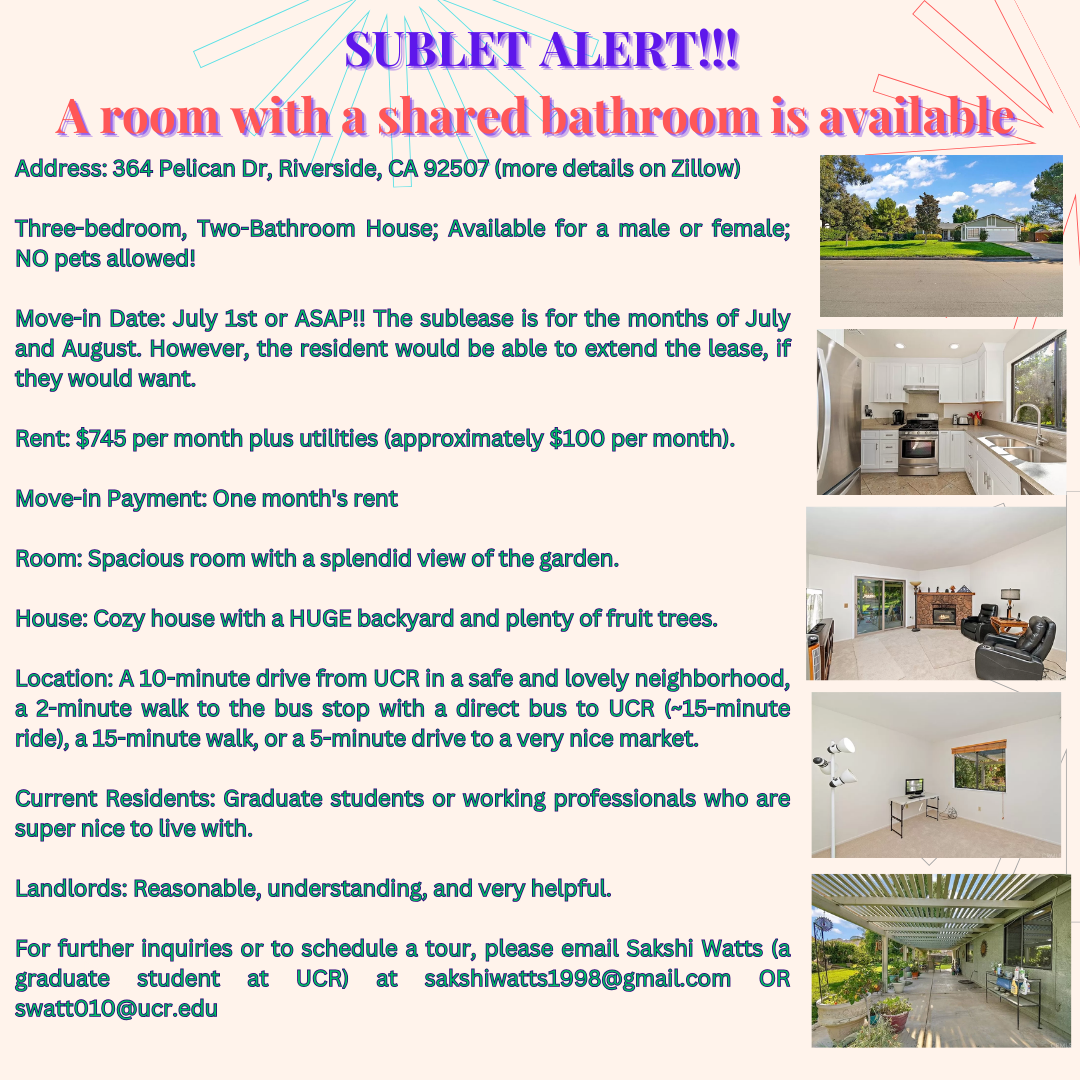 Please see the FLYER below for the details of an available sublease, and spread the word.
