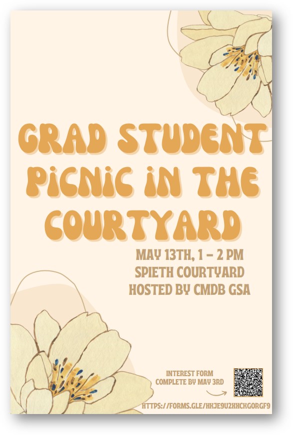 Grad Student Picnic in The Courtyard! Hosted by the CMDB GSA May 13th, 1 - 2 pm (Interest form due by May 3rd QR code in the flyer).