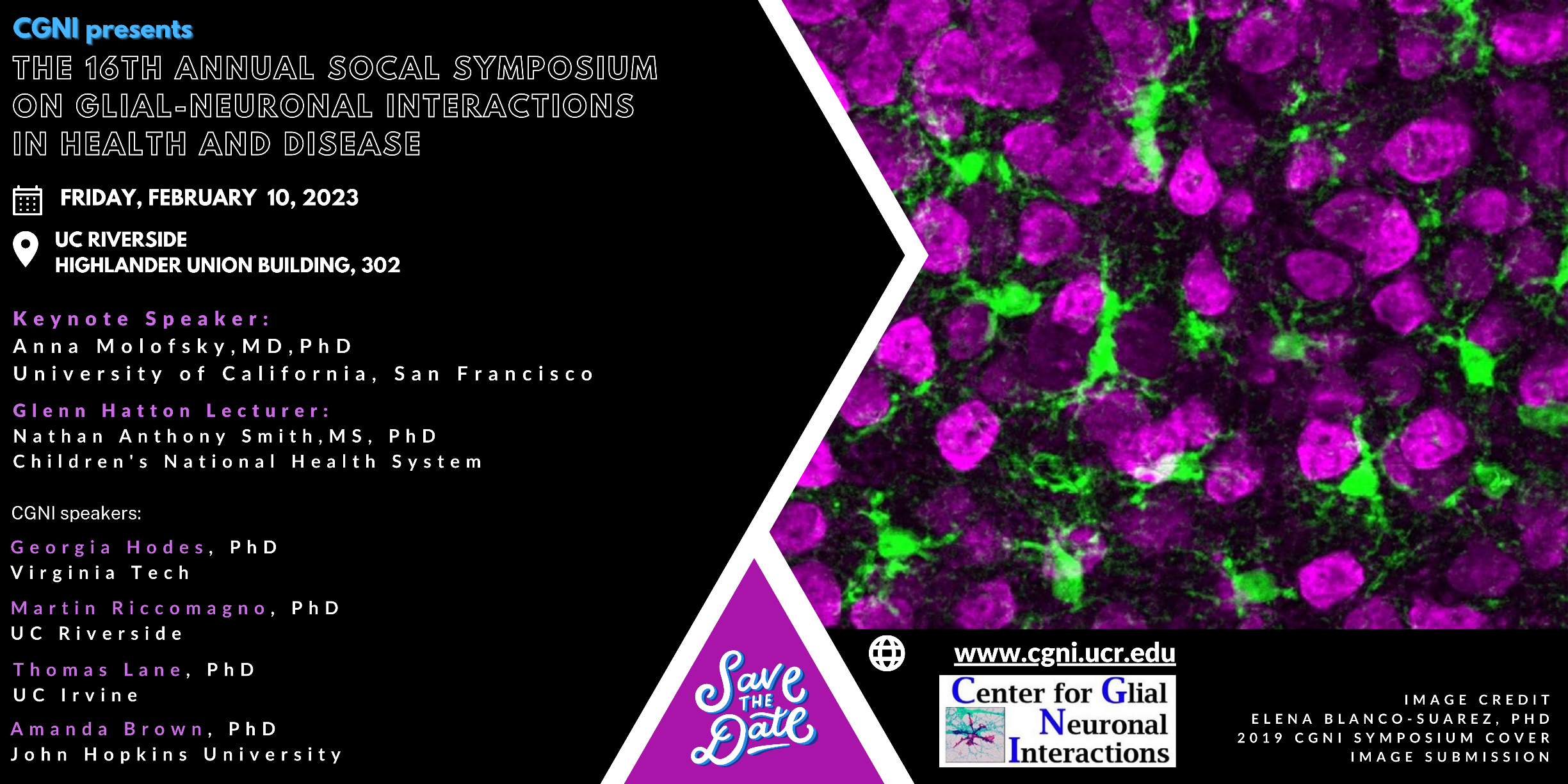 Mark your calendars! The Center for Glial-Neuronal Interactions is happy to announce the 16th Annual SoCal Symposium on Glial-Neuronal Interactions in Health and Disease will take place on Friday February 10, 2023 at the Highlander Union Building, UC Riverside.