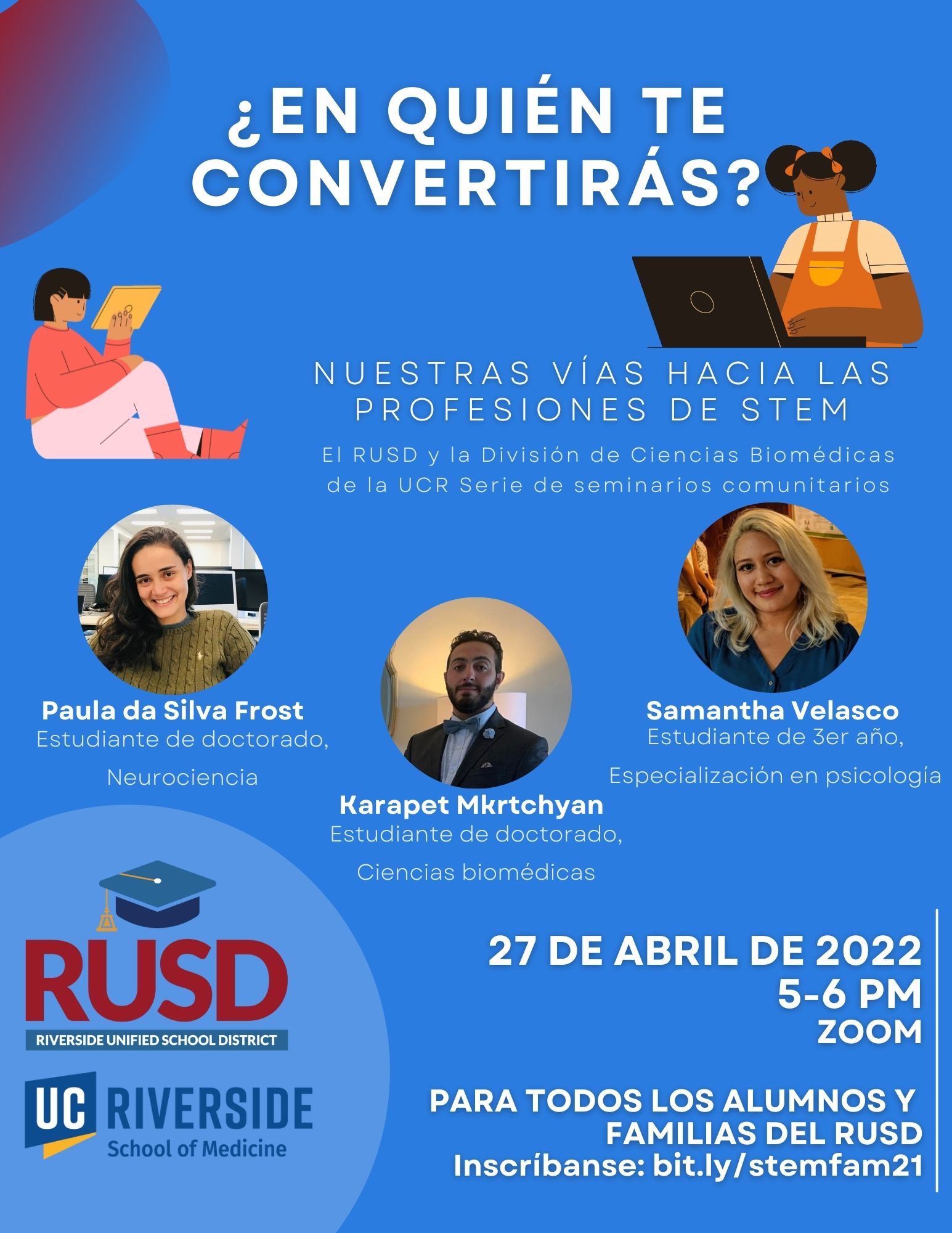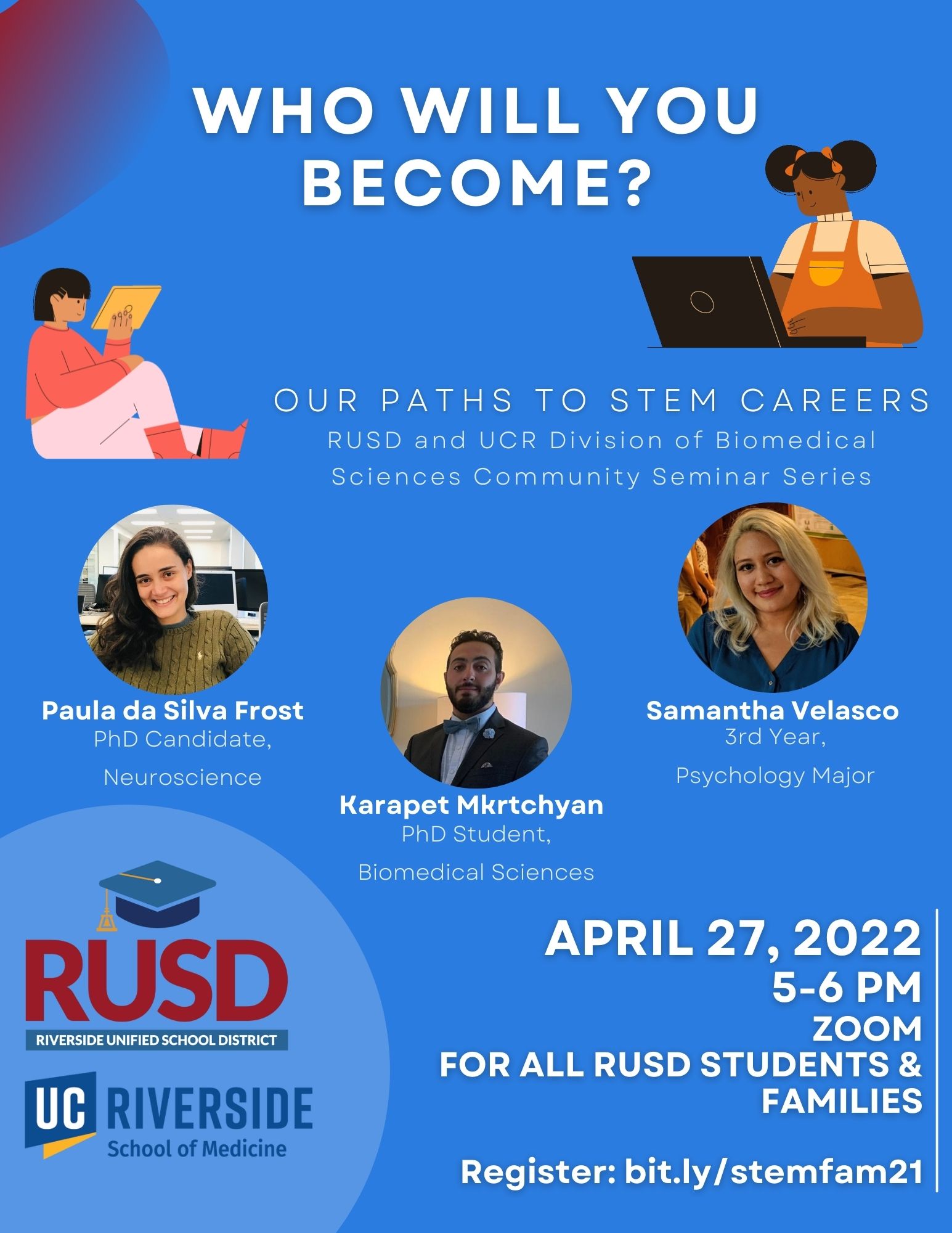 [Biomed_students_masters] 4/27 Webinar- "Who Will You Become? Our Paths to STEM Careers" - UCR BMSC x RUSD