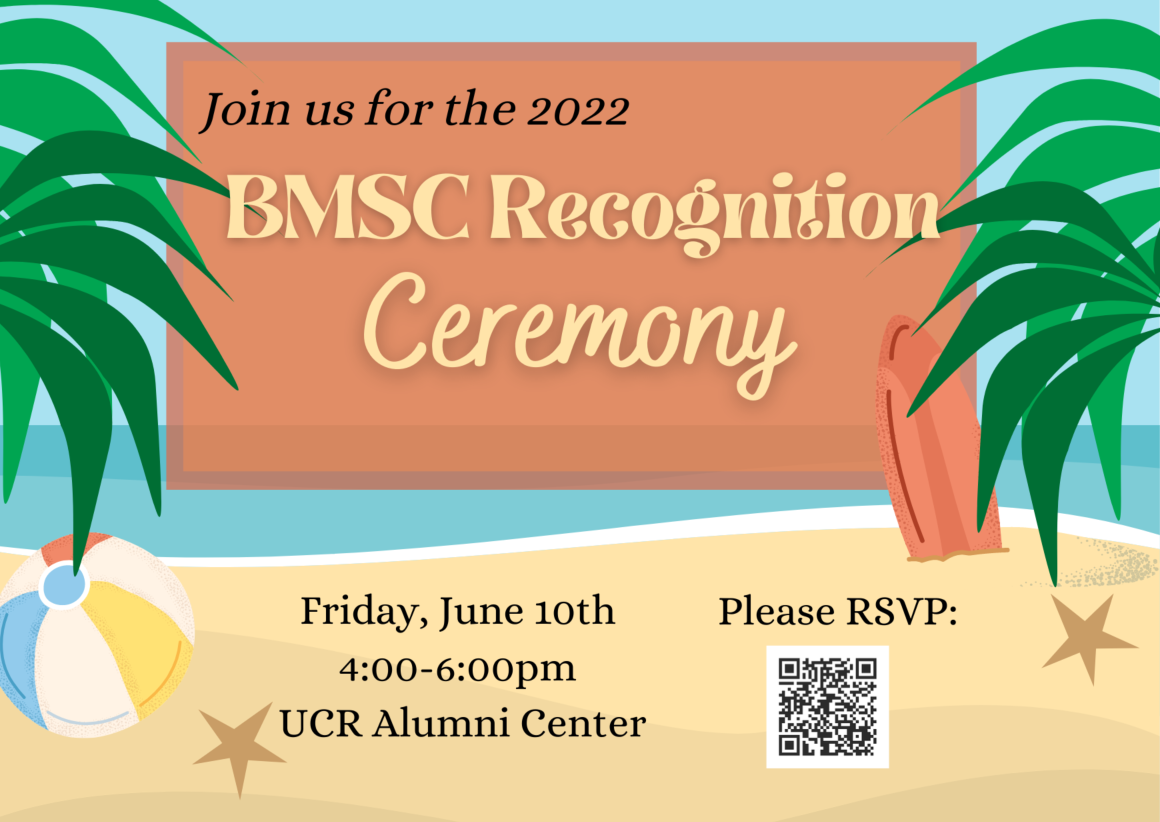 You are cordially invited to attend the annual Biomedical Sciences Graduate Program Recognition Ceremony hosted by the BMSC mini-GSA. We are so excited to come together in-person on Friday, June 10 from 4:00-6:00pm at the UCR Alumni & Visitor Center. Join us and connect with the Biomed and SOM community as we celebrate the end of the academic year by spotlighting student achievements and recognize faculty and staff who support the graduate program.