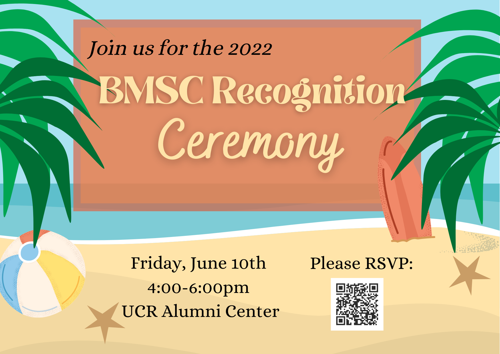 You are cordially invited to attend the annual Biomedical Sciences Graduate Program Recognition Ceremony hosted by the BMSC mini-GSA. We are so excited to come together in-person on Friday, June 10 from 4:00-6:00pm at the UCR Alumni & Visitor Center. Join us and connect with the Biomed and SOM community as we celebrate the end of the academic year by spotlighting student achievements and recognize faculty and staff who support the graduate program.