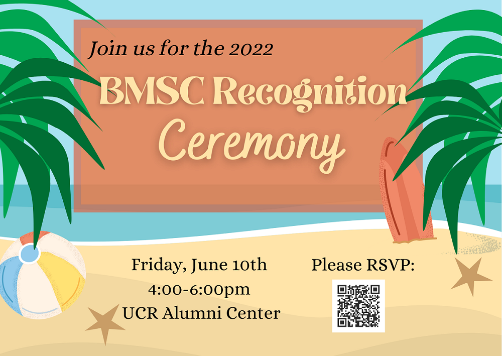 Join us for the annual Biomedical Sciences Graduate Program Recognition Ceremony. We are so excited to come together on Friday, June 10 from 4:00-6:00pm at the UCR Alumni & Visitor Center.