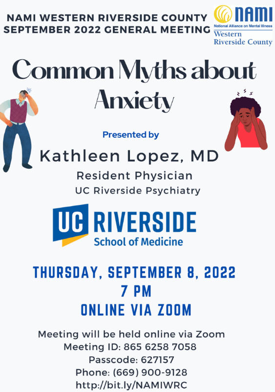 Dr. Kathleen Lopez, 3rd year UCR Psychiatry Resident is giving a virtual lecture today, September 8th at 7pm on 'Common Myths About Anxiety.' Anxiety is the most common psychiatric condition in the US general population.