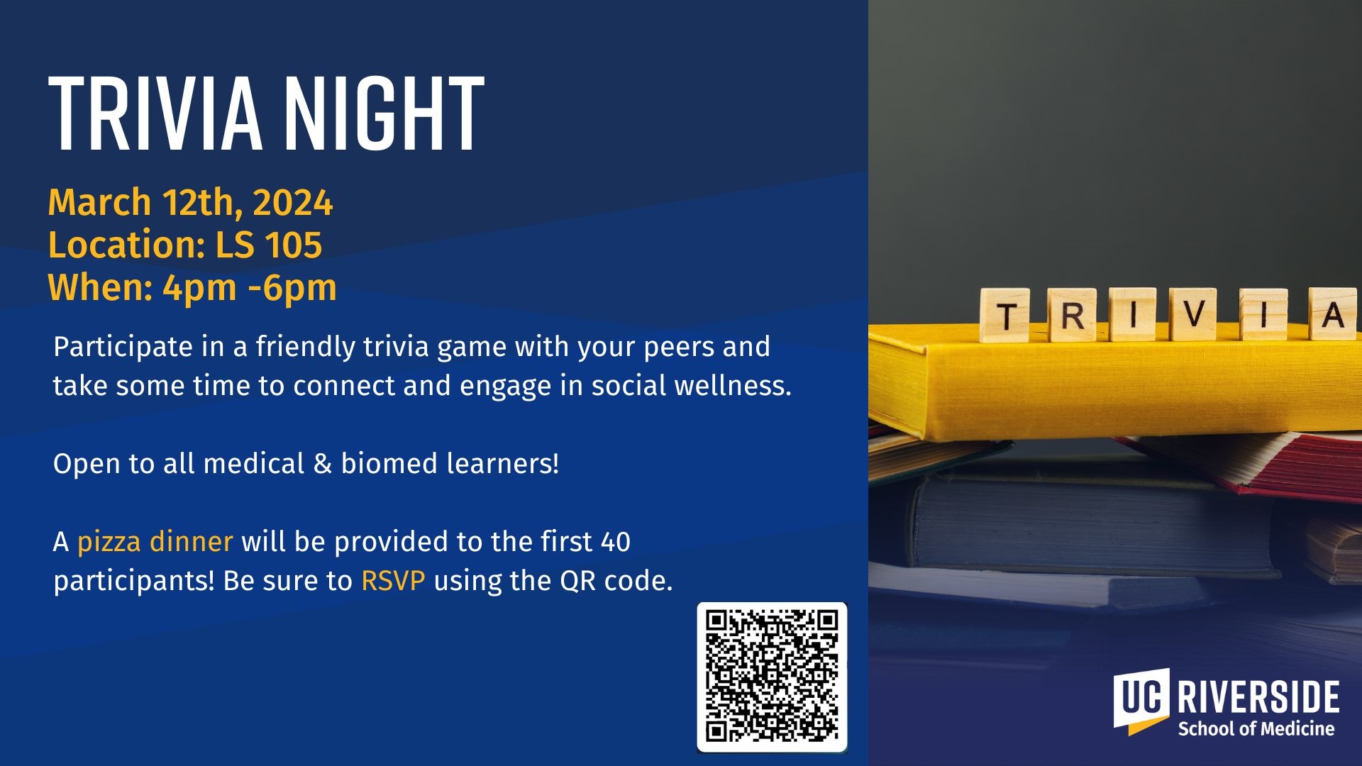 The office of Support & Wellness will be hosting a Trivia Night on March 12th from 4-6pm. A pizza dinner will be provided for the first 40 participants to RSVP. This is a good way to practice social wellness and engage with your peers.