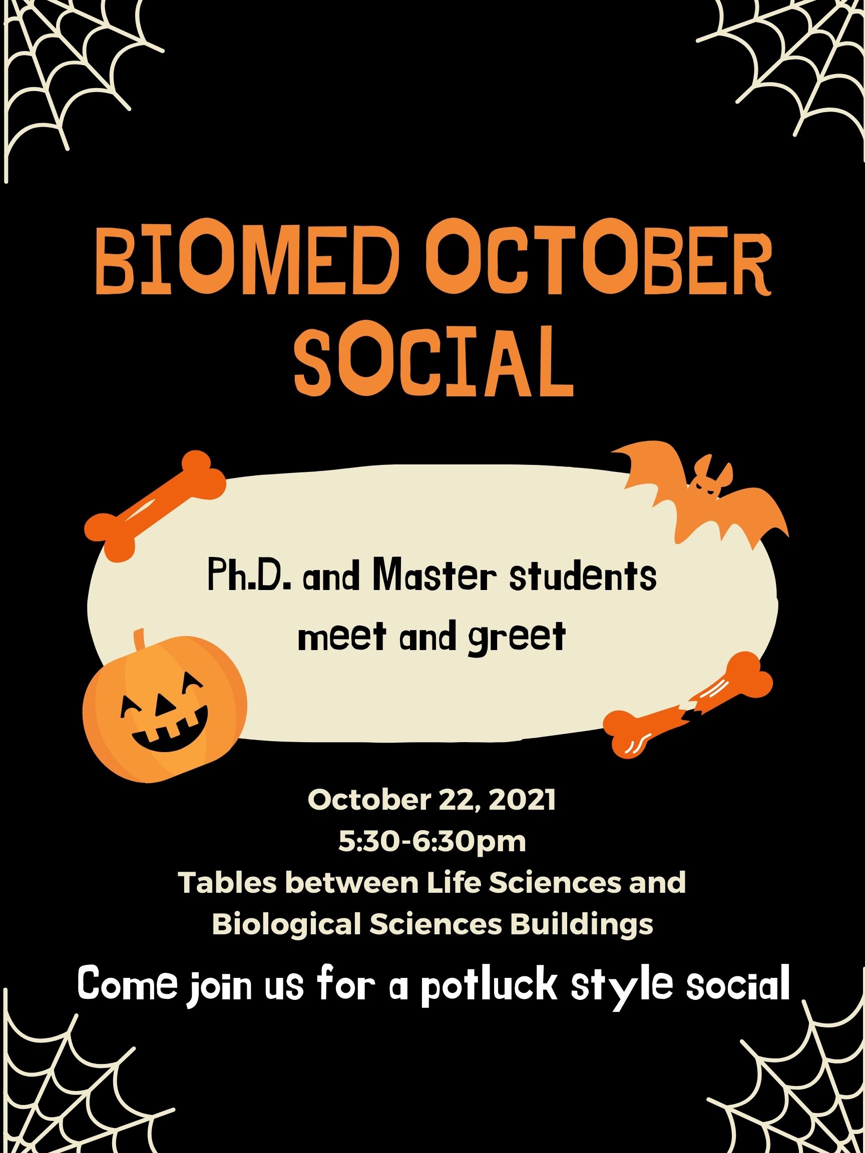 Please join us this Friday at 5:30pm for our October 2021 social event! This social's main purpose is for the students of the Biomed program (Both Ph.D. and MS) to join together for some yummy food and beverages. This will be a Halloween-themed potluck style event so please sign up for a food or beverage item on the google sheets provided in this email and bring your feisty kitty ears! More information can be found in the flyer attached to this email. If there are any questions or concerns, please do not hesitate to contact either Laura or me @ (ldove002ucr.edu<mailto:ldove002ucr.edu>, rhern156 at medsch.ucr.edu<mailto:rhern156 at medsch.ucr.edu>).
