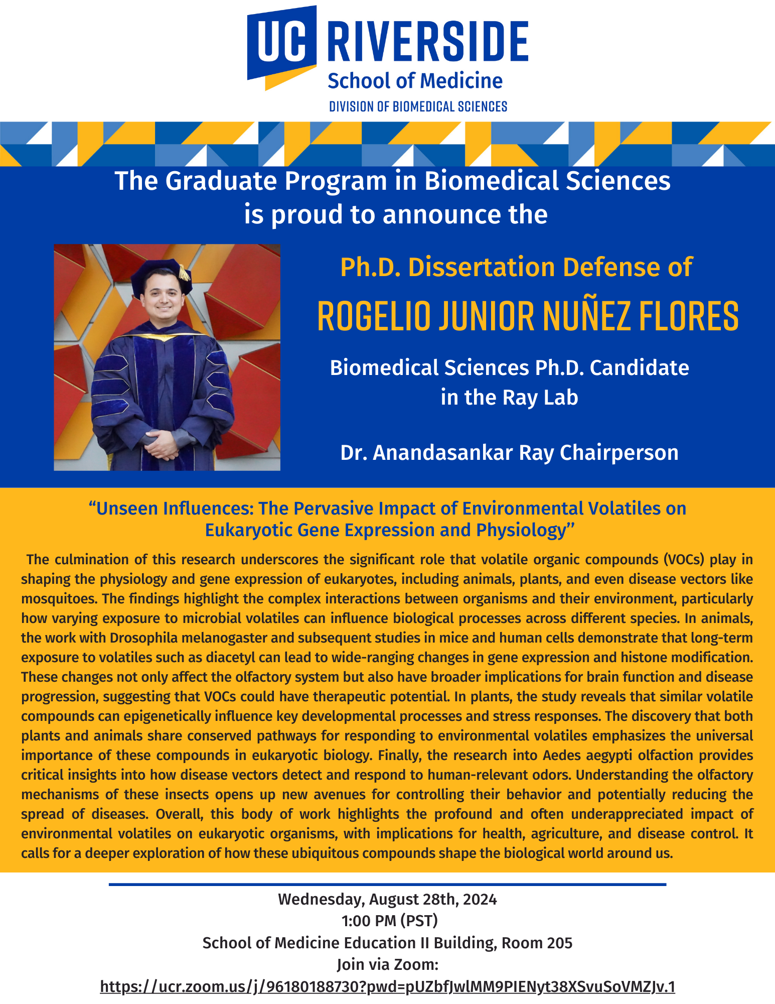 The Graduate Program in Biomedical Sciences is pleased to announce the Dissertation Defense of Biomedical Sciences Ph.D. Candidate, Rogelio Junior Nuñez Flores.