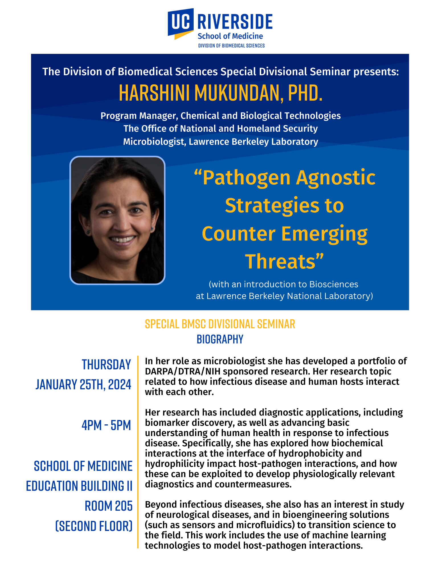 Please join us for TODAY's Division of Biomedical Sciences Special Divisional Seminar talk, TODAY, January 25th, 2024, at 4pm in the School of Medicine Education Building II, Rm. 205.