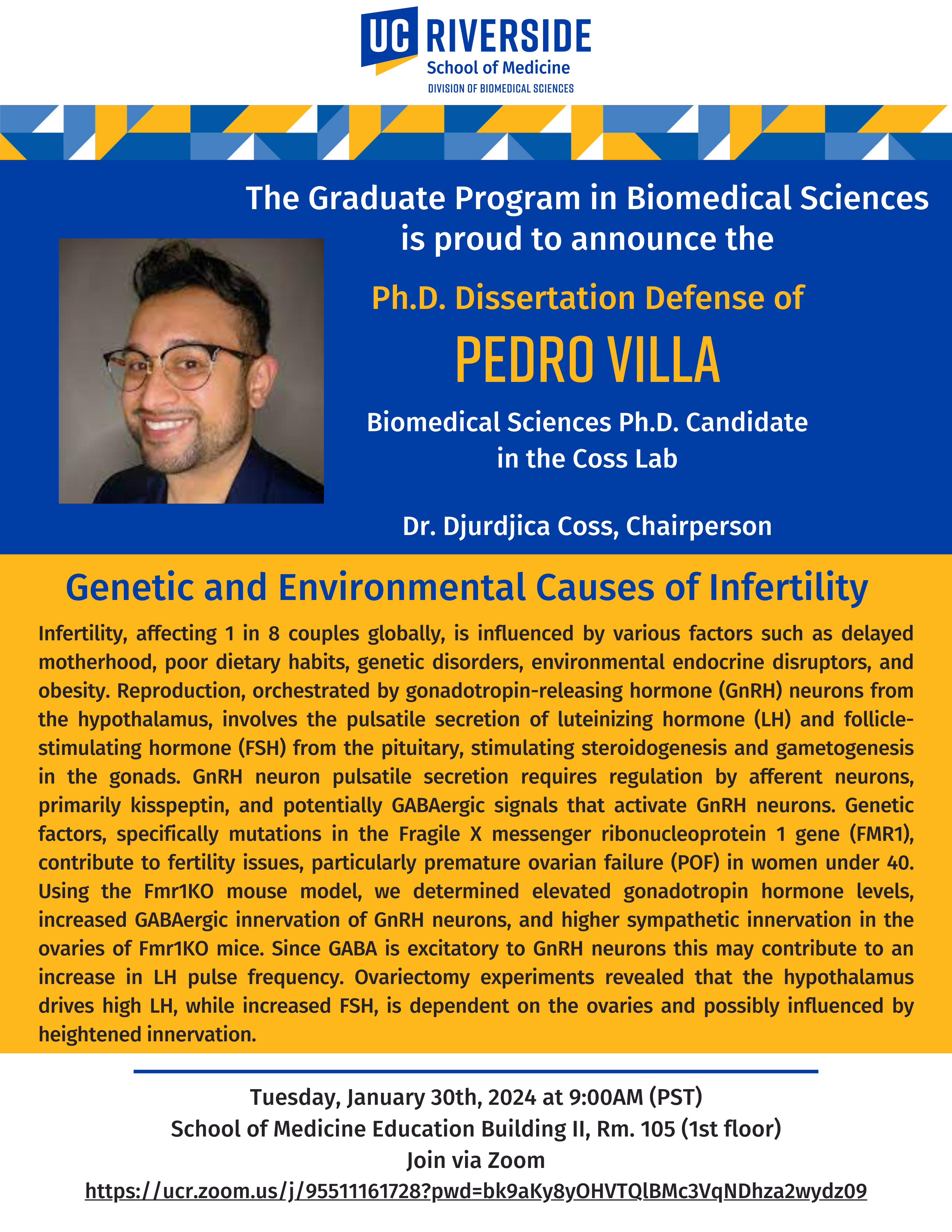 The Graduate Program in Biomedical Sciences is pleased to announce the Dissertation Defense of Biomedical Sciences Ph.D. Candidate, Pedro Villa.