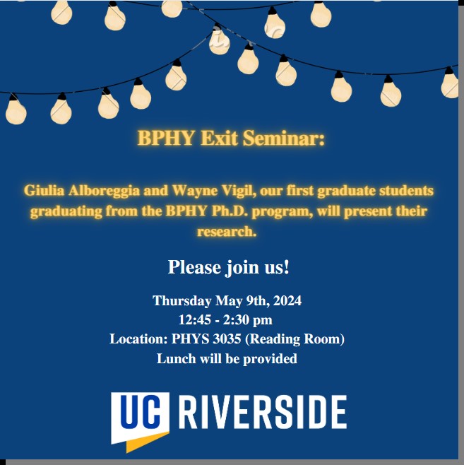 Everyone in the group is invited to our Lunch Seminar on May 9th, 2024. This seminar holds special significance as it will feature the research presentations of our first two students graduating from our BPHY Ph.D. program. (Details are in the invitation below.)