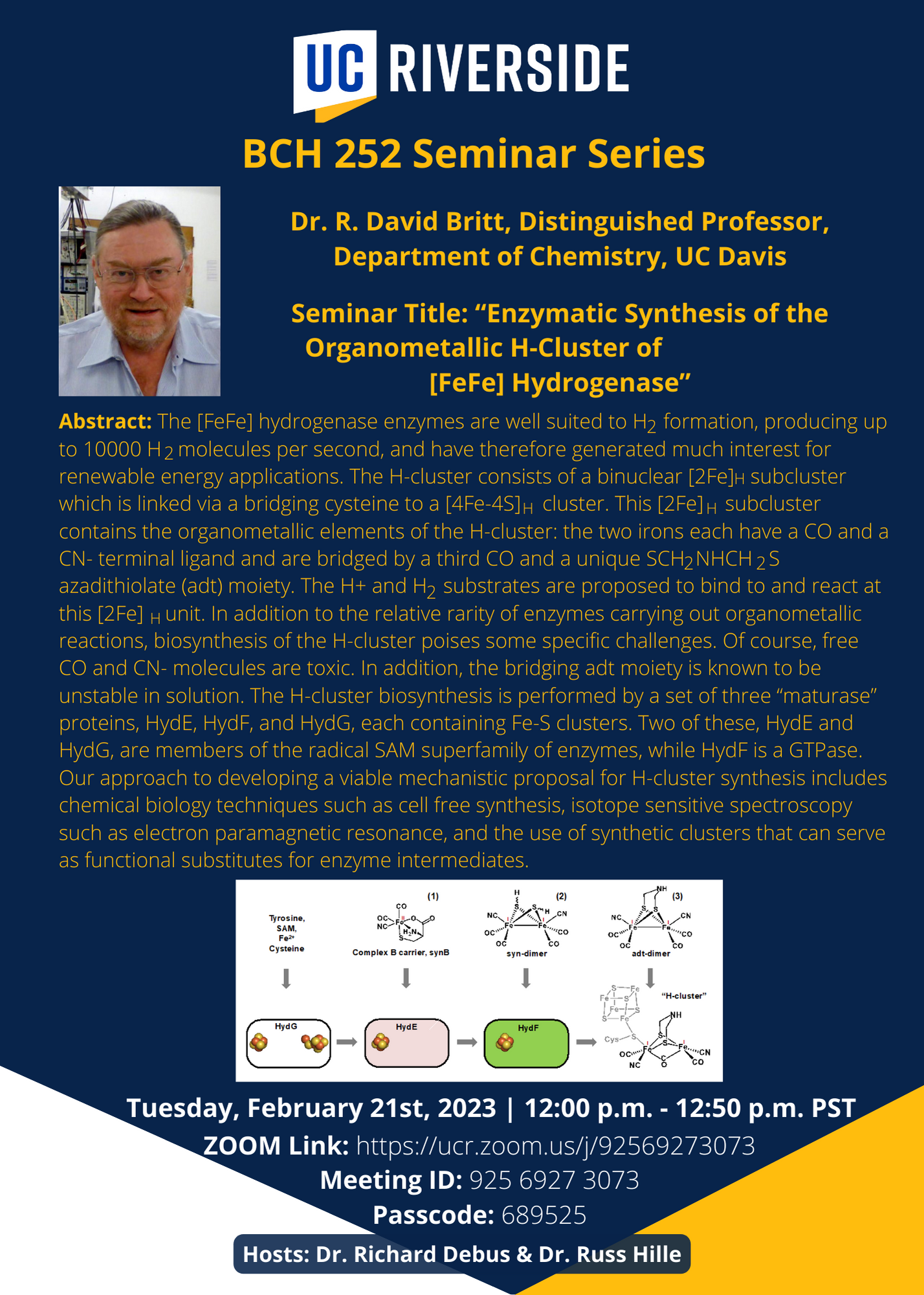[Bphystudent] BCH 252 Seminar Series Winter 2023 - Dr. R. David Britt, UC Davis - 2/21/2023 12:00pm