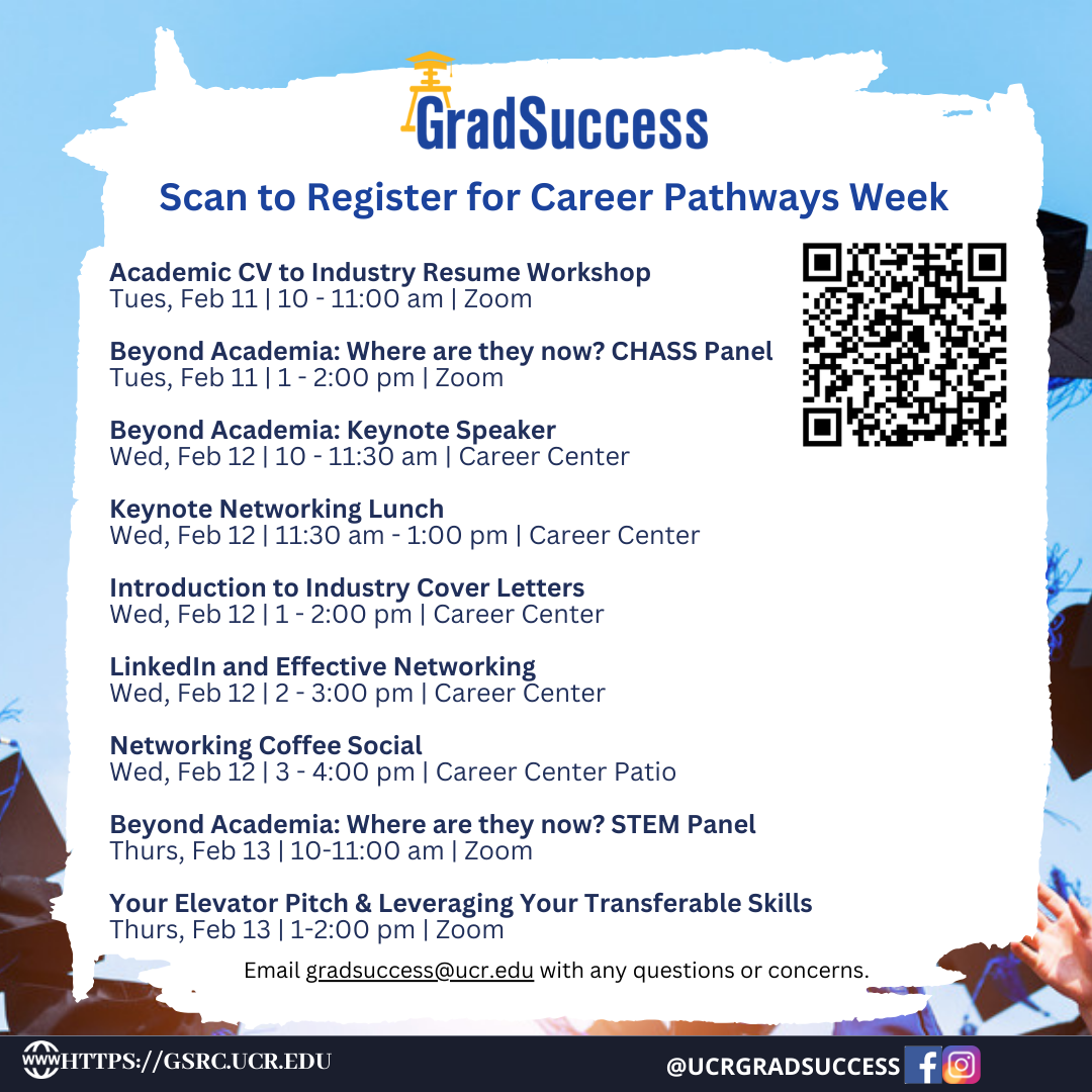 You can still RSVP and attend the workshops, and join us for the Coffee Social today at 3pm at the Career Center. There are also virtual events happening on Thursday. Details are on the attached flyer or on our website: https://gsrc.ucr.edu/careerpathways/beyondacademia