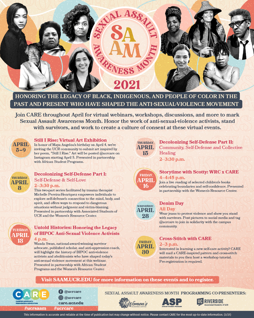 Join us for our events during April for Sexual Assault Awareness Month. This month, through our events and social media, we're honoring the legacy of Black, Indigenous, and People of Color in the past and present who have shaped the anti-sexual violence movement. View our calendar attached! Event links are also all available at linktr.ee/ucrcare.