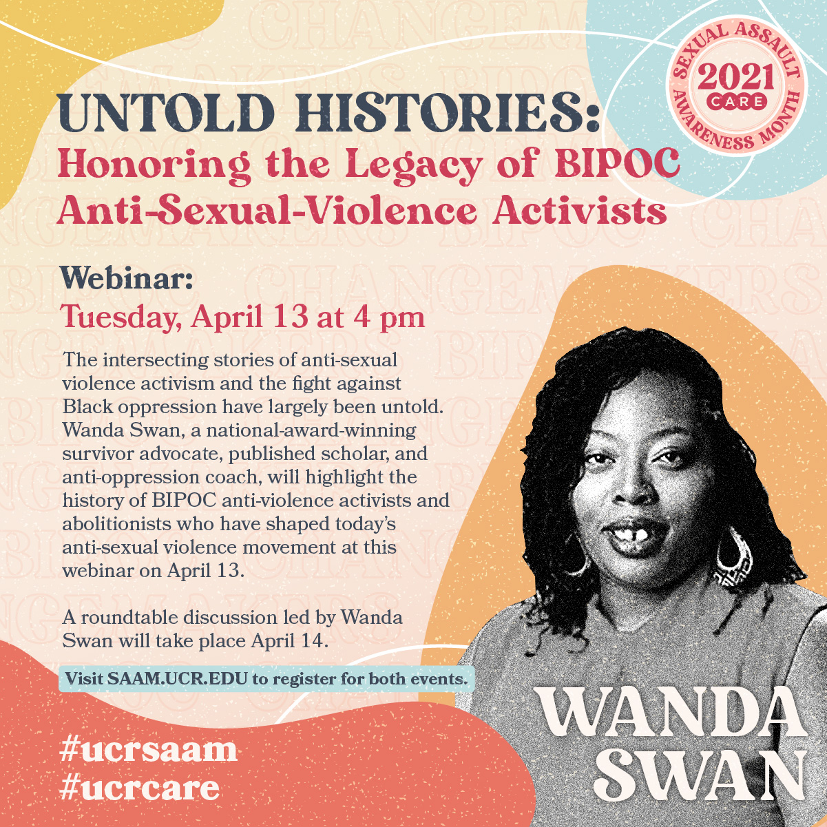 The intersecting stories of anti-sexual violence activism and the fight against Black oppression have largely been untold. Wanda Swan-- national award winning survivor advocate, published scholar, and anti-oppression coach-will highlight the history of BIPOC anti-violence activists and abolitionists who have shaped today's anti-sexual violence movement. In partnership with WRC & ASP. *The first 20 folks who register with their UCR email and attend will receive a CARE Consent Tshirt AND we're raffling giveaways to attendees at the event!