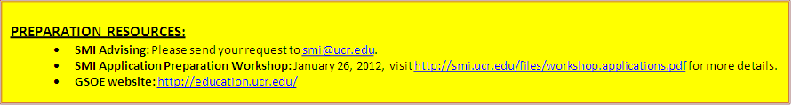 [PREPARATION RESOURCES: * SMI Advising: Please send your request to smi at ucr.edu. * SMI Application Preparation Workshop: January 26, 2012, visit http://smi.ucr.edu/files/workshop.applications.pdf for more details. * GSOE website: http://education.ucr.edu/]<mailto:smi@ucr.edu>