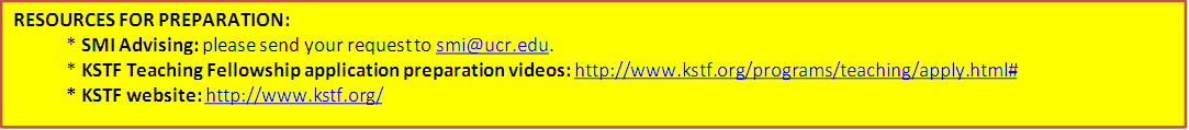 [RESOURCES FOR PREPARATION: * SMI Advising: please send your request to smi at ucr.edu. * KSTF Teaching Fellowship application preparation videos: http://www.kstf.org/programs/teaching/apply.html# * KSTF website: http://www.kstf.org/] <mailto:smi at ucr.edu>