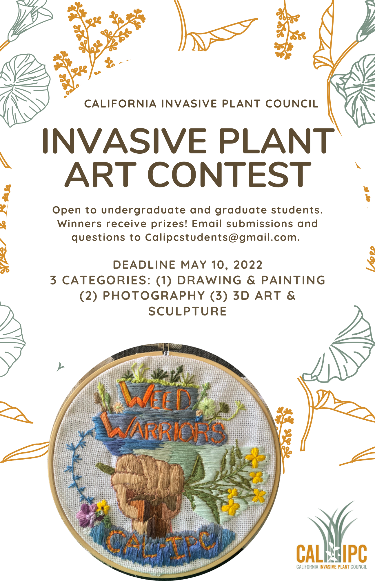 The California Invasive Plant Council (Cal-IPC) student section is happy to announce that we are hosting an INVASIVE SPECIES ART CONTEST this year! This contest is open to all community college, undergraduate and graduate students currently enrolled at an accredited institution. More information can be found on our blog site: Cal-IPC Student & Early Career Section Call for Art Submission<https://calipcstudents.wixsite.com/studentsection/post/call-for-applications-cal-ipc-invasive-plant-art-contest>