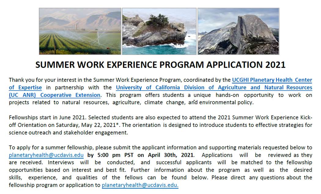 > <https://ucghi.universityofcalifornia.edu/centers-of-expertise/planetary-health/call-applications-summer-work-experience>