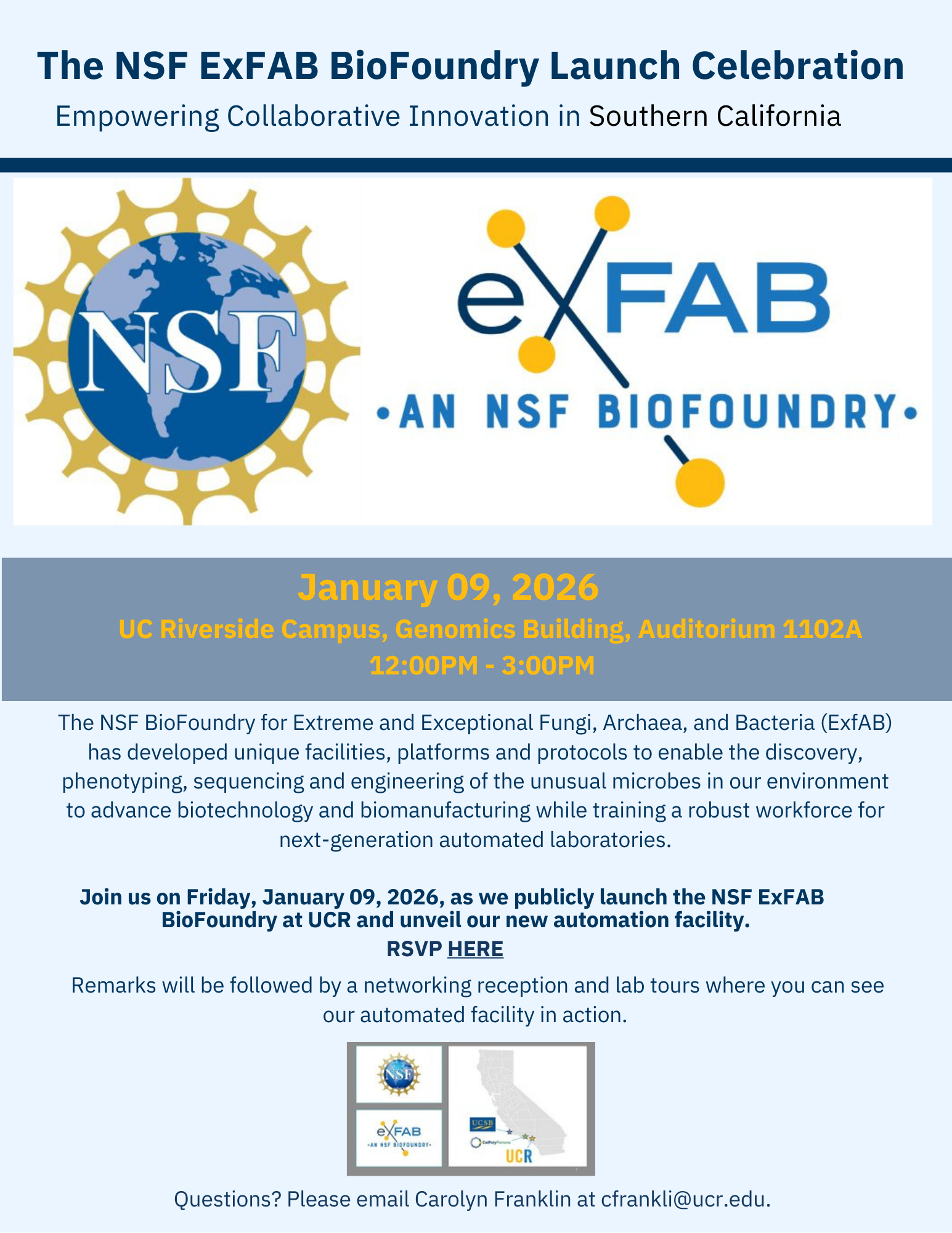 BioFoundry Launch Celebration* on *January 9, 2026*, from *12:00 PM to 3:00