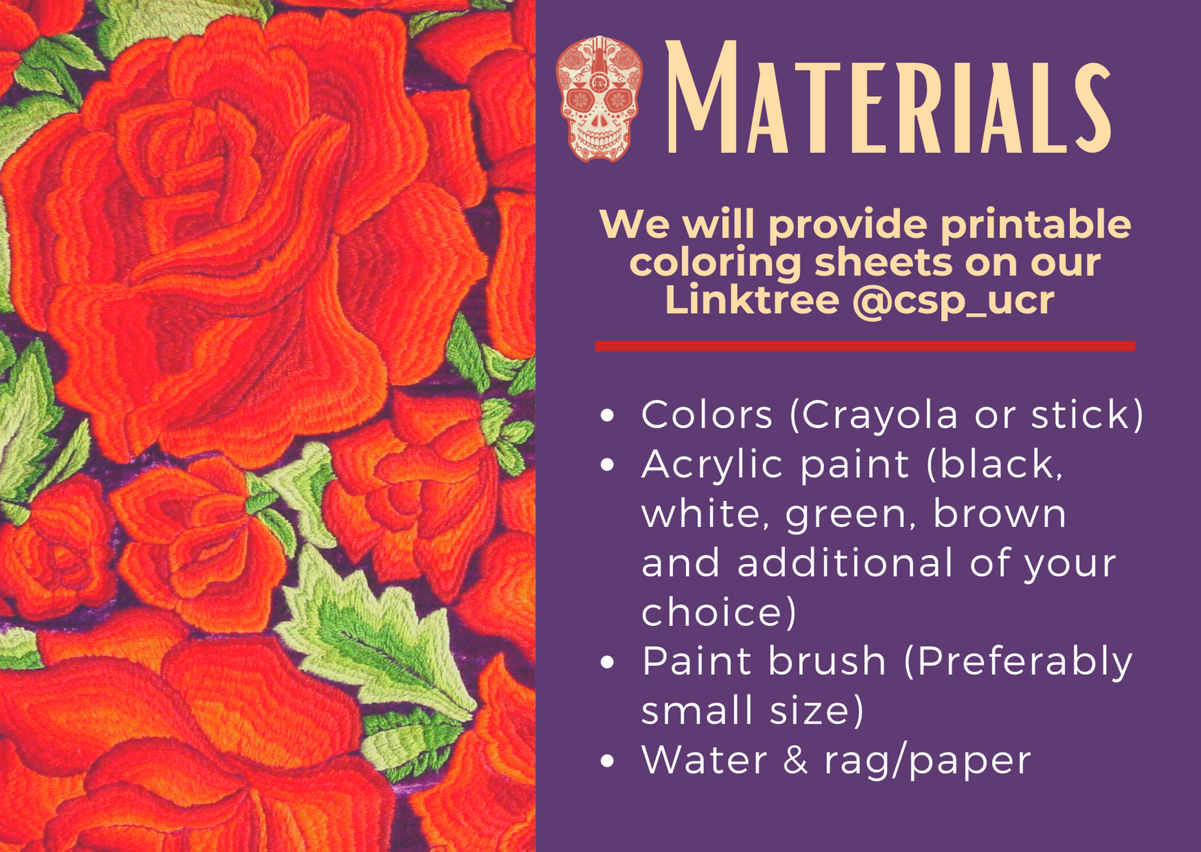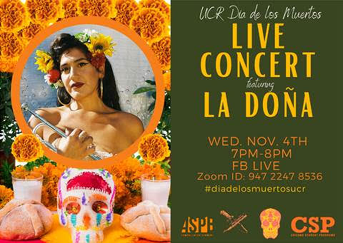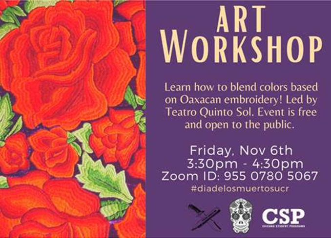 Come and join this spiritual and cultural celebration that captures the unity between life and death as we honor the lives of deceased friends and family. Día de los Muertos: Recuerdos de Nuestros Antepasados is a week-long series of virtual programs November 2 – 6, 2020 brought to you by Chicano Student Programs, Teatro Quinto Sol and Raza Assembly. The events are free and open to the public. Share a personal recuerdo (memory) or your altar and tag us on social media using #diadelosmuertosucr!