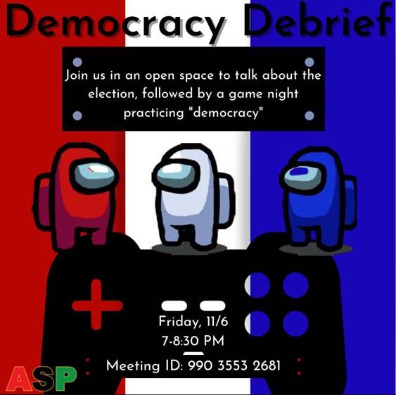 * Join us in an open space to talk about the election, followed by a game night practicing “democracy”
