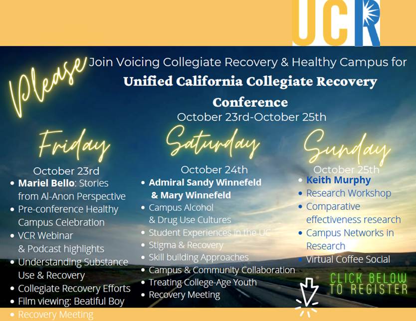Please join us for the upcoming Unified California Collegiate Recovery Conference, Friday, October 23rd, Saturday October, 24th, and Sunday, October 25th. This conference aims to build and enhance communities that support students in recovery from addiction. With guest speakers from Project SAFE, the University of California education system, and rehabilitation networks, all focused on what we can do to enhance the experiences and resources for the collegiate recovery community and engage in future research to improve the health and wellbeing of this student population. This event is free and open to students, faculty, staff, healthcare providers, community members, and anyone else interested in learning more about what we can do together. This virtual conference will take place via Zoom. If you have any questions about the event, please email mcurr007 at ucr.edu<mailto:mcurr007 at ucr.edu>. Please see our invitation below, as well as a link to register. The first 200 attendees will receive a conference gift bag. Hope to see you there. The preliminary agenda is attached. Check out our webpage<https://healthycommunities.ucr.edu/voicing-collegiate-recovery> for updates. Attached is the preliminary agenda.
