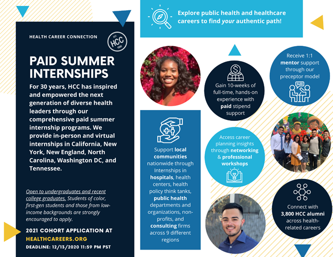 Many of our best intern candidates (including several of you!) learn of HCC from alumni outreach and referrals. We appreciate you continuing to promote HCC to your friends, family, and colleagues. The deadline for students to apply is December 13, 2020. Undergraduates and recent graduates interested in joining HCC’s 2021 summer internship cohort can apply here: https://www.healthcareers.org/internship-program/application/<https://healthcareers.us14.list-manage.com/track/click?u=88518e8feea2d039fb1e4ce50&id=e18f10f370&e=0a8c09393b>