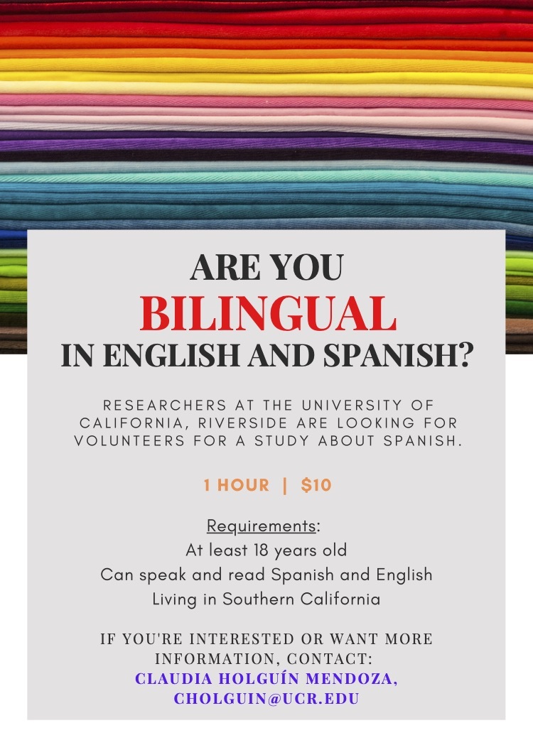 My name is Maria Gutierrez, a second year PhD Candidate in the Hispanic Department at UCR. I am currently collaborating with Professor Holguin and Professor Higby on a Bilingual Study. We are currently looking for Bilingual people who learned English after the age of 8 years old and are not older than 45 years old. Refer to attachment.