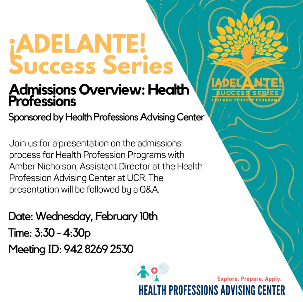 Join us for a presentation on the admissions process for the Health Professions Program with Amber Nicholson, Assistant Director at the Health Professions Advising Center at UCR. The presentation will be followed by a Q&A.