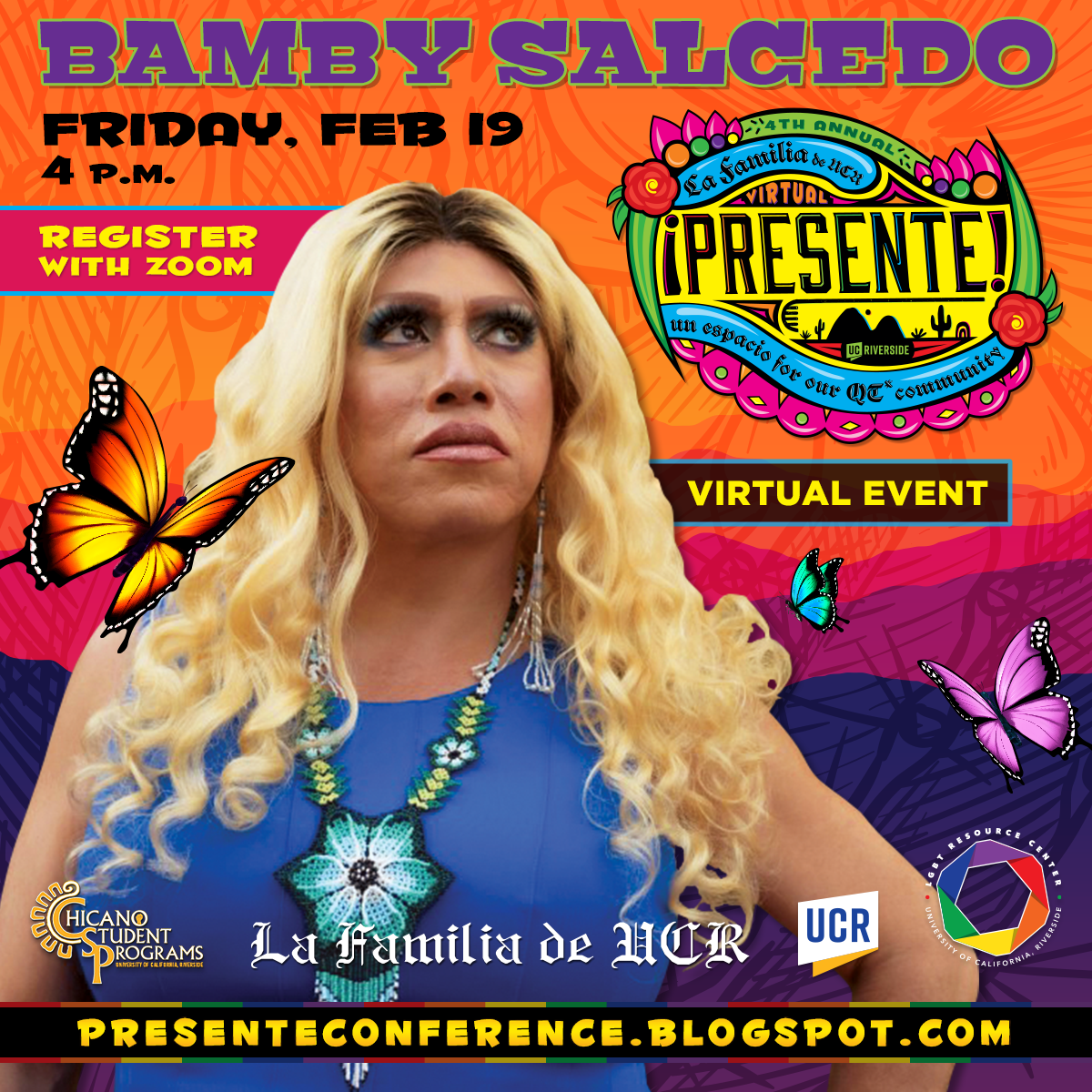 Join us for a conversation with Bamby Salcedo, "Madrina de honor" for the ¡Presente! Conference - un espacio for our QT* community. Bamby is a national and international transgender Latina Woman who completed her master's degree in Latino/a Studies. Bamby is the President and CEO of the TransLatin@ Coalition, a national organization that focuses on addressing the issues of transgender Latinxs in the US. Bamby has served and participated in many local, national and international organizations and planning groups. This work mediates intersections of race, gender, sexuality, age, social class, HIV+ status, immigration status and more.Closed captioning is provided for this event. It is a free event open to all.