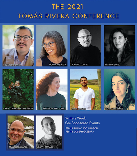 The annual Tomás Rivera Conference, initiated in 1988, honors the legacy of Tomás Rivera by providing an international forum for reflection on the contributions of Chicanos and Latinos in the worlds of the arts, literature, creative writing, culture, business, medicine, and education. Readings and conversations by Eduardo Corral, Karla Cornejo Villavicencio, Donna Miscolta and Kristen Milares Young, Roberto Lovato, Javier Zamora, Patricia Engel, and Felicia Luna Lemus.