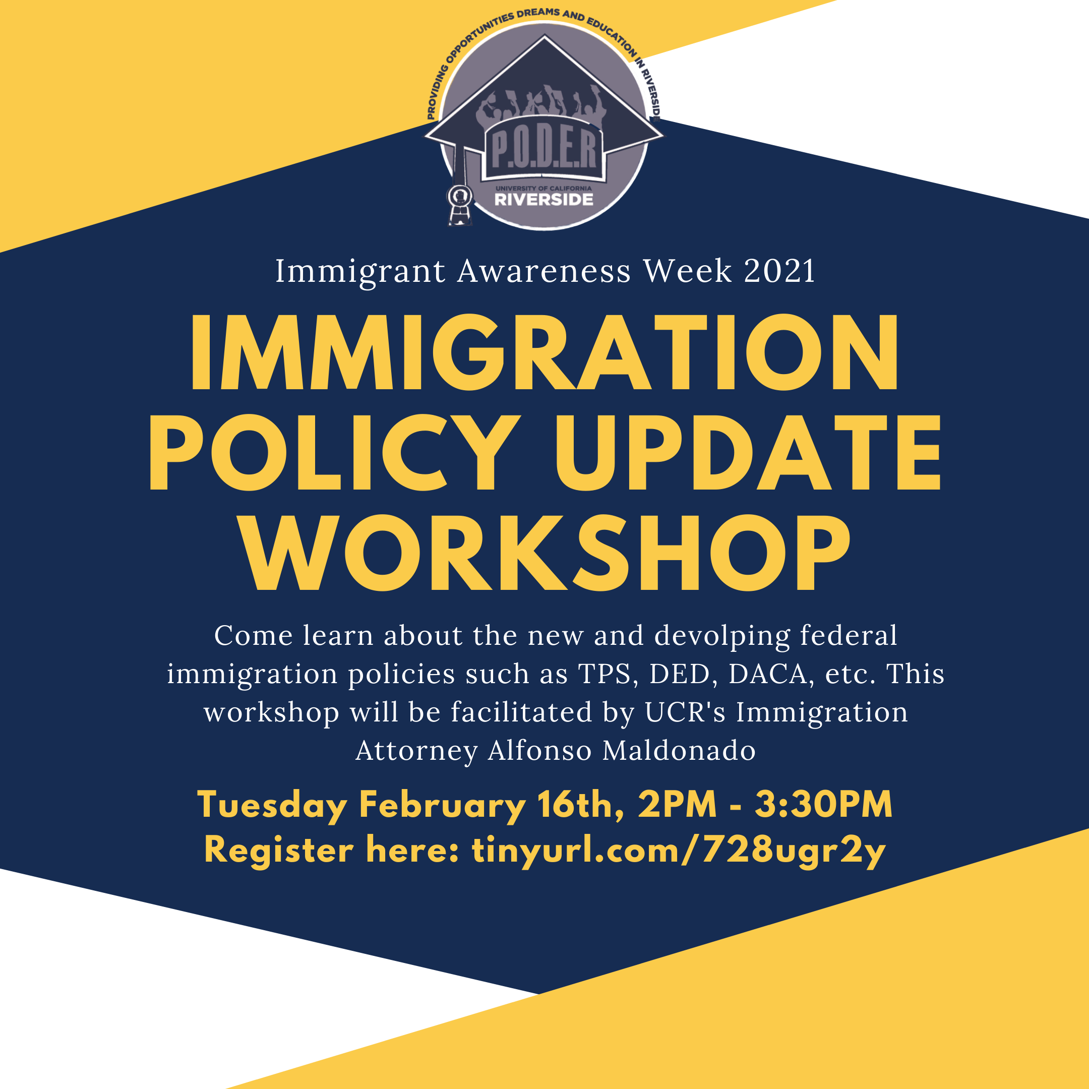 Come learn about the new and developing federal immigration policies such as TPS, DED, DACA, etc. This workshop will be facilitated by UCR's Immigration Attorney Alfonso Maldonado. Register here<http://tinyurl.com/728ugr2y>.