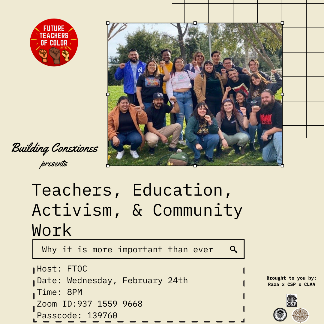 Description: Future Teachers of Color (FTOC) Committed to Racial Justice. FTOC's mission is to bring together and build a community of racial justice-oriented students of Color from UCR who want to pursue teaching in a K-12 or higher education, and other careers in the education field.