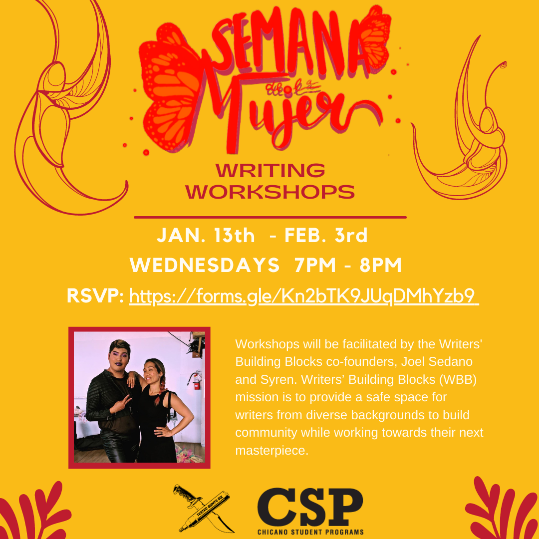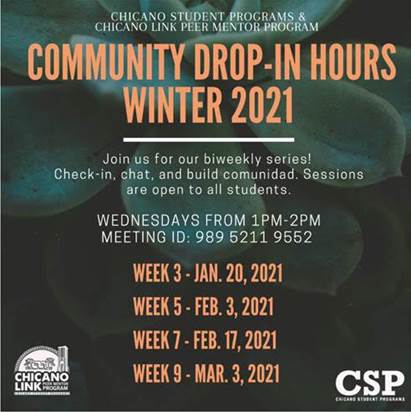 Please join us! Shout out to our student organizations who are co-sponsoring our upcoming events. Thank you TQS, LBSA, MEChA, FTOC, and Raza Assembly. In addition we are hosting our Community Drop In Hour tomorrow. You do not need to be part of the respective organization to attend. Workshops are open to all.