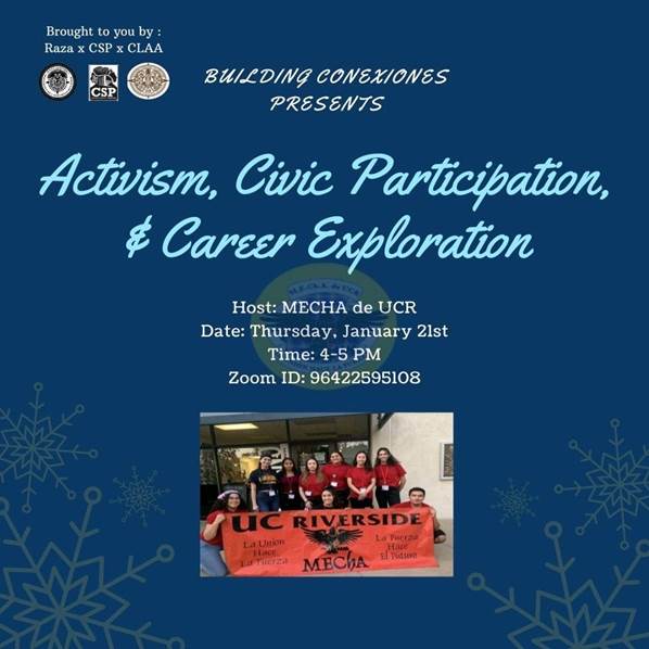 * Building Conexiones - Raza Assembly and Chicano Latino Alumni. (Guests include: Supervisor Victor Manuel Perez, Community Organizer Diana Flores, Assistant Superintendent of Human Resources, Juan Cabral, and Professor, Martha Escobar.