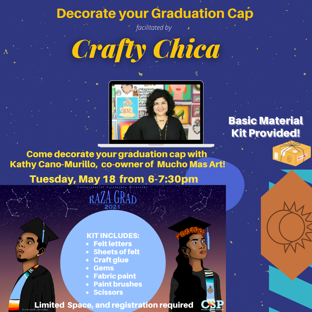 Please sign up to decorate your grad cap in community with your peers. Crafty Chica will help guide you and unlock your creativity. If you cannot attend we have extra kits that can assist you when you are ready to create. We will start mailing out the kits tomorrow.