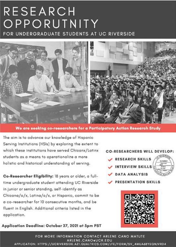 I am recruiting undergraduate co-researchers for this project. I invite you to apply for this opportunity if you are interested. Project details and eligibility requirements are attached. The application for the co-researcher position is due on October 27, 2021, at 5pm, PST. Apply at: https://ucriverside.az1.qualtrics.com/jfe/form/SV_4MUA68yeQNjvRd4. The time duration to complete this pre-screening application is 15-30 minutes. If you are selected to be part of the research team, you will be notified by October 29, 2021 and provided with further information.