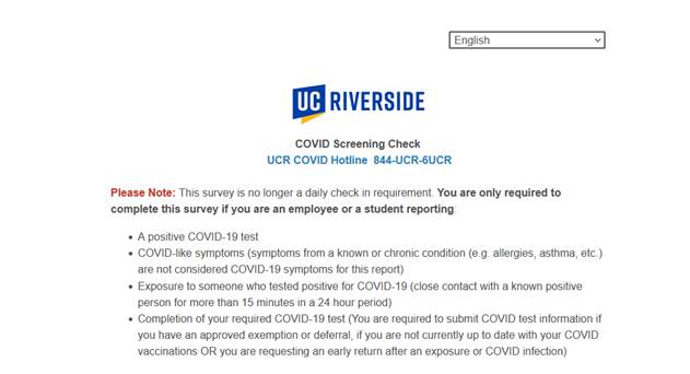 Moving forward, UC Riverside students, employees, and visitors are required to fill out the COVID Screening Check only to report one of the following: