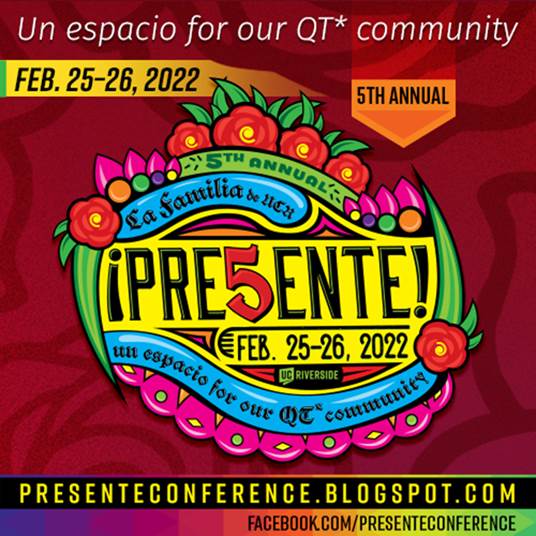 La Familia de UCR<https://www.instagram.com/lafamiliadeucr/>, Chicano Student Programs<http://csp.ucr.edu/>, and the LGBT Resource Center<http://out.ucr.edu/> of UC Riverside invite you to join Un Espacio For Our QT Community at the 5th ¡Presente! Conference on February 25-26, 2022. Our conference theme is “Homecoming!” as we celebrate connections made by conference participants over the years and return to an in-person event. The ¡Presente! Conference is a queer college conference with a focus on people who identify as part of the Latin/South/Central American diaspora, including but not limited to Afro-Indigenous, Afro-Latinx, Brown, Latinx, Chicanx, and Indigenous people. People of all genders and sexualities are welcome to apply to attend.