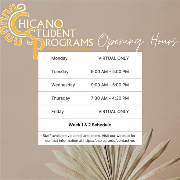 Web: csp.ucr.edu | Facebook<https://www.facebook.com/chicanostudentprograms/> | Instagram <https://www.instagram.com/csp_ucr/>